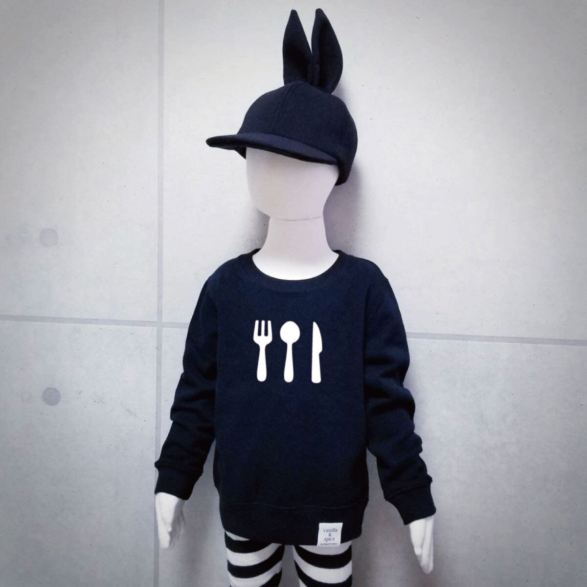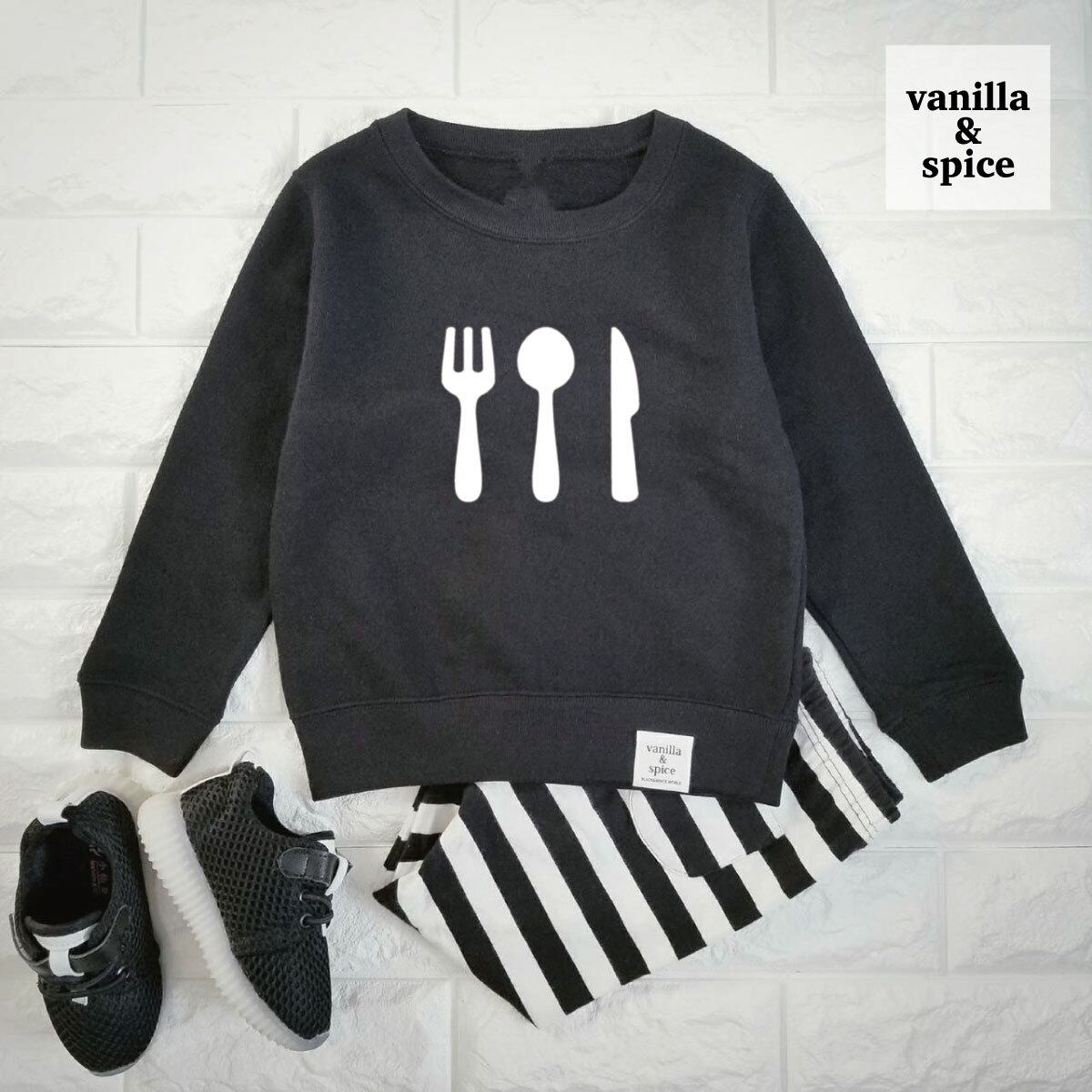 キッズ 子供服 vanilla&spice カトラリー プリント 長袖 スウェット トレーナー ブラック スプーン フォーク ナイフ