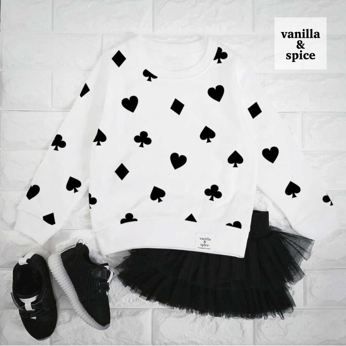 キッズ 子供服 vanilla&spice トランプ柄 プリント 長袖 スウェット トレーナー ホワイト ハート スペード ダイヤ クローバー