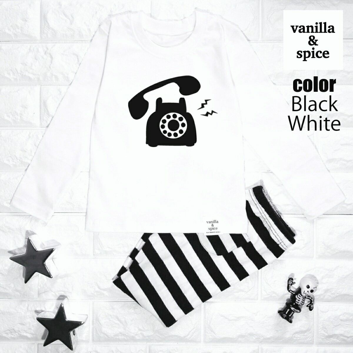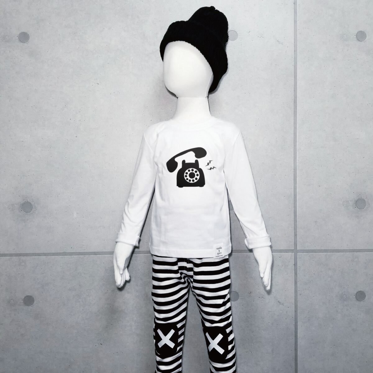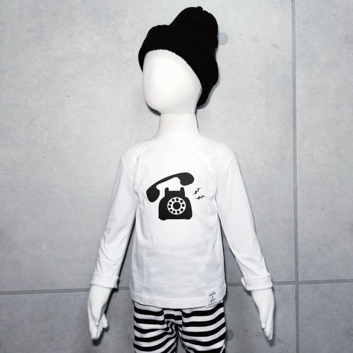 黒電話 プリント 長袖Tシャツ ロンT ホワイト キッズ 子供服 vanilla&spice 電話 レトロ